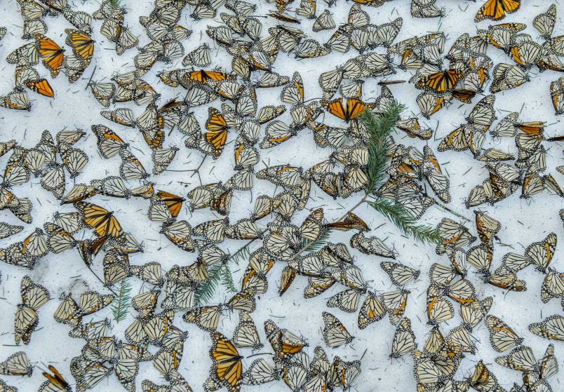 Monarcas en la nieve, es el nombre que el fotógrafo español le bautizo a su imagen, en él plasma varios ejemplares de mariposas monarca, caídas durante su migración a Estados Unidos y Canadá, el lugar donde fue plasmada la fotografía, es el Bosque de las Mariposas, en Michoacán, México, en marzo de 2016.